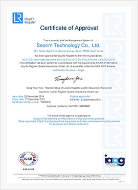 또한 ISO9001 및 AS9100D(KS Q 9100)를 획득하여 철저한 품질 경영을 수행 하고 있습니다.